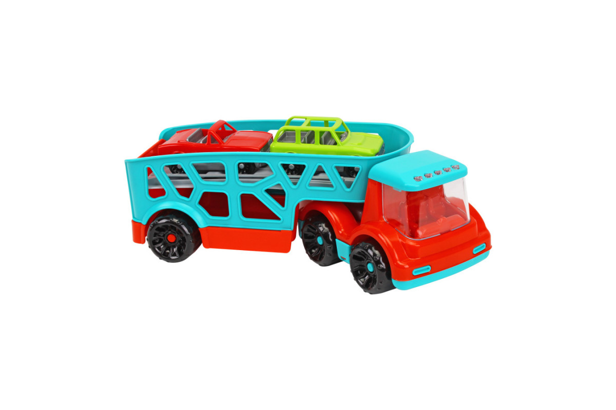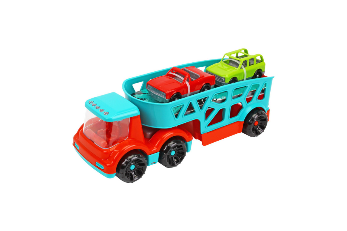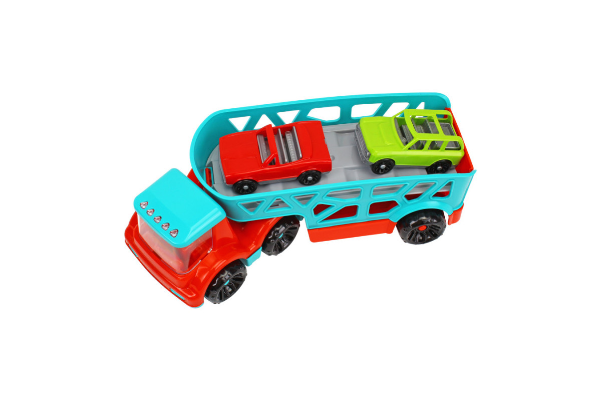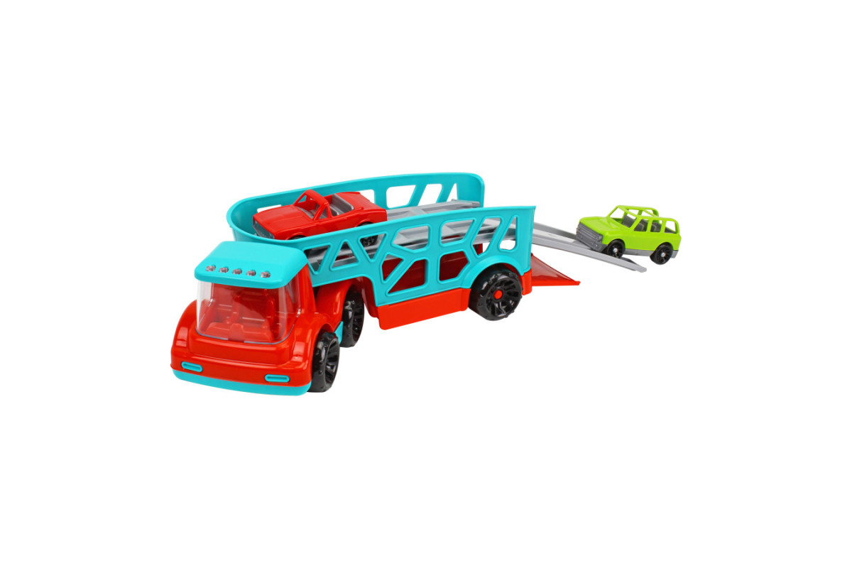 Цей потужний автовоз (32х13х14 см) з рухомим причепом та великим прозорим вітровим склом вражає своєю реалістичністю. У комплекті ви знайдете дві яскраві легкові машинки, готові до будь-яких мандрівок! Завдяки платформам – нижній з відкидним бортом-трапом та верхній з висувним трапом – завантаження та розвантаження машинок перетвориться на захопливу гру. Ваш малюк буде в захваті від можливості створювати власні логістичні маршрути та сценарії!