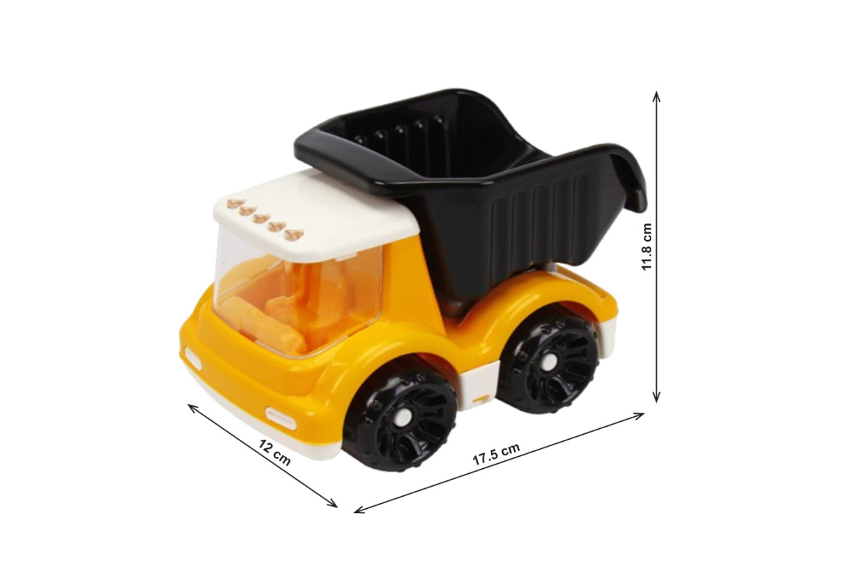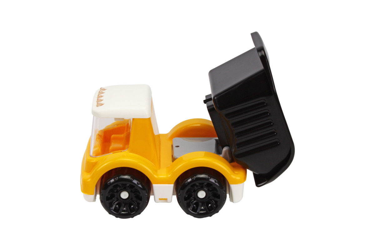 Реалістичний дизайн: Перекидний кузов, як у справжнього самоскида, та прозора кабіна з "габаритними ліхтарями" на даху повністю занурять дитину у світ будівництва.