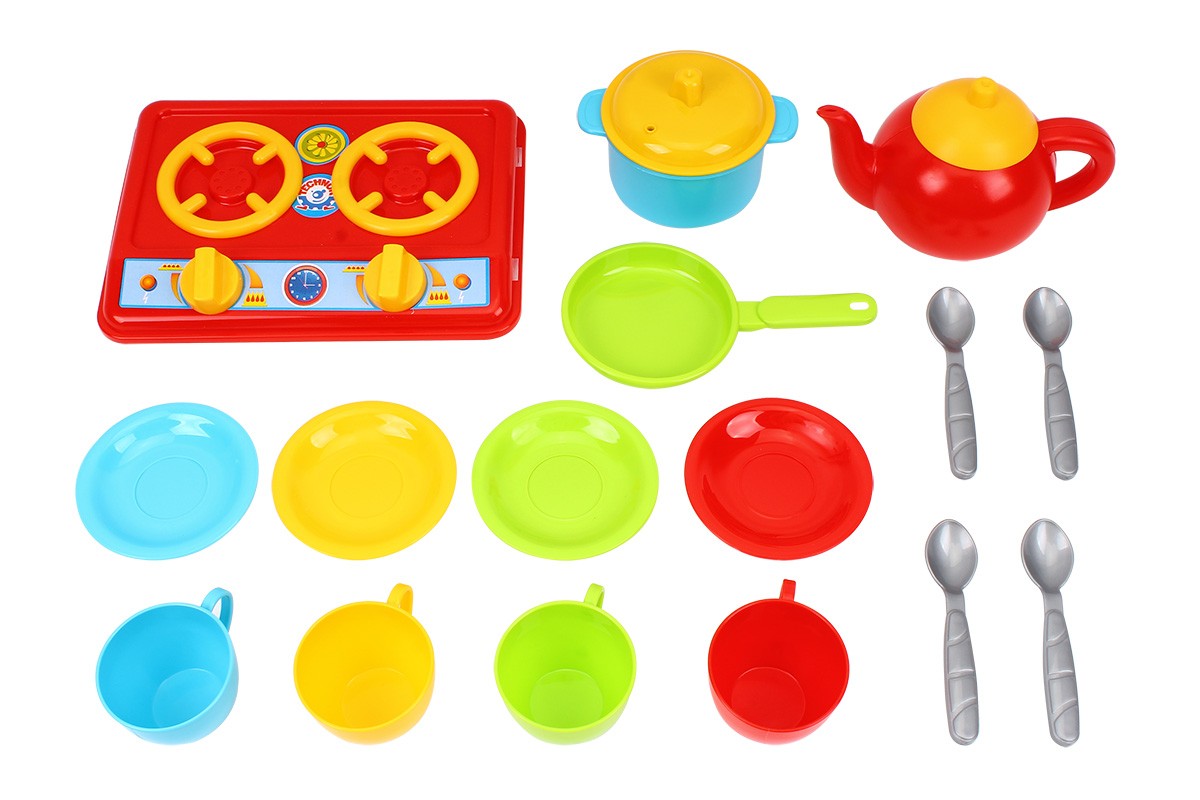 У комплект входить варильна поверхня, 4 чашечки, 4 блюдечка, 4 ложки, чайник, каструля та сковорідка.