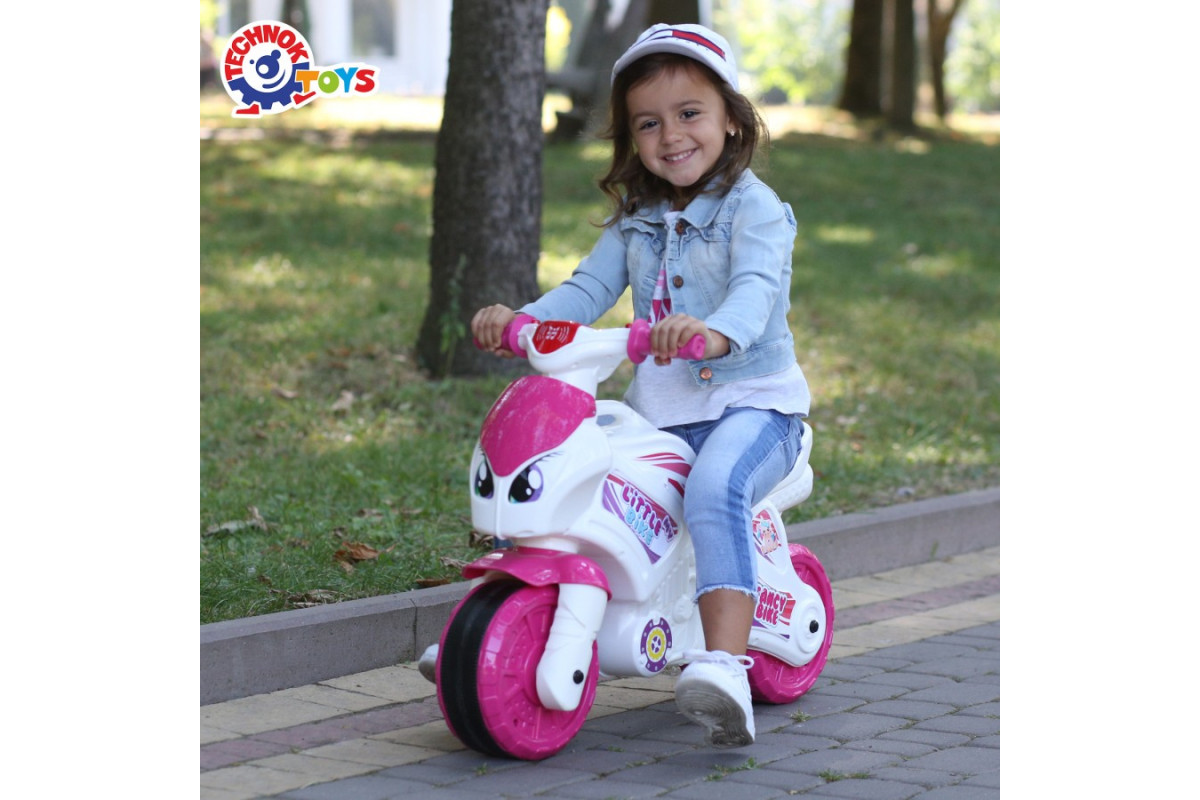 Розкішний біло-рожевий «Мотоцикл ТехноК» для справжніх принцес. Ця іграшка зі звуковими та світловими ефектами зачарує малечу та принесе їй море позитивних емоцій.