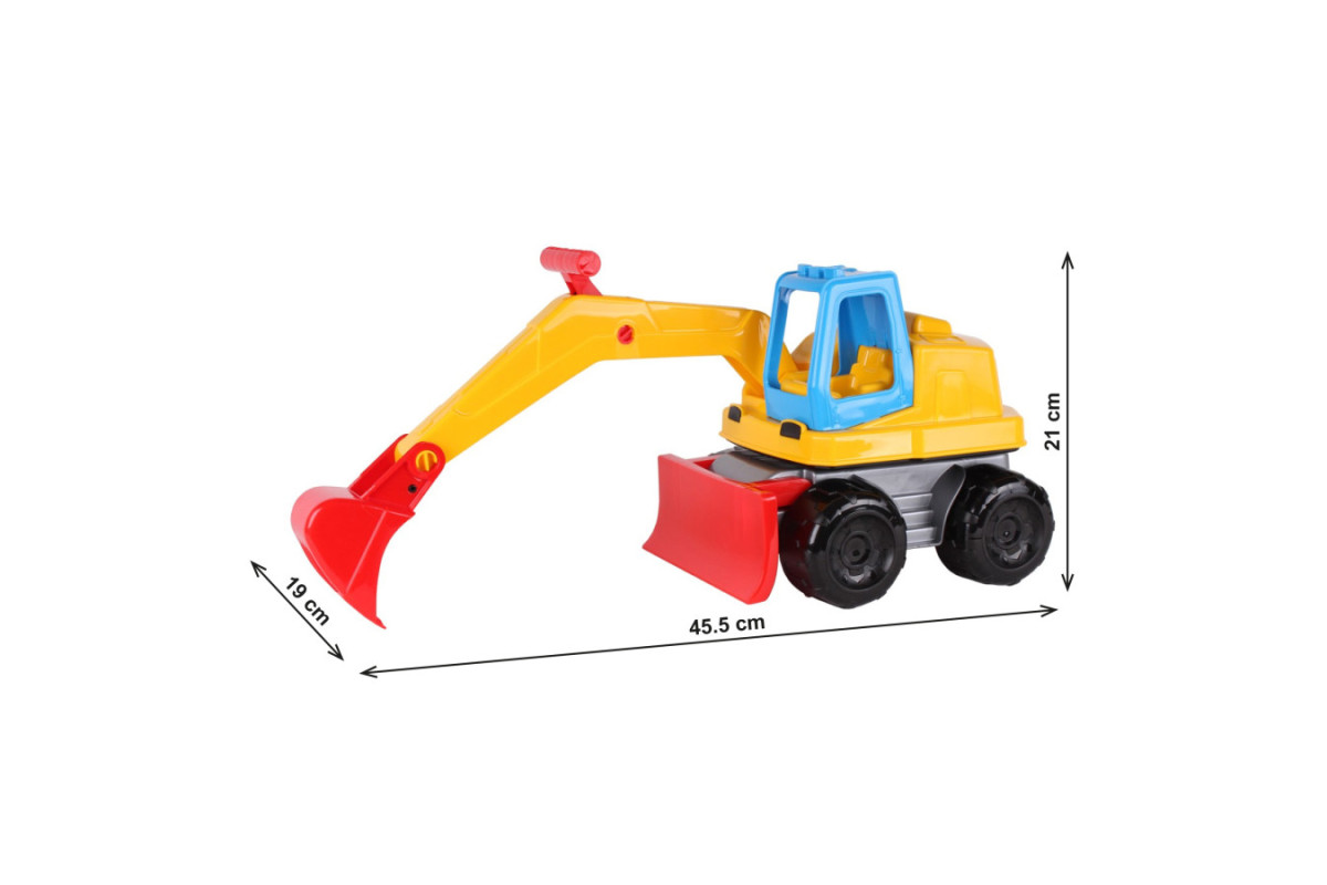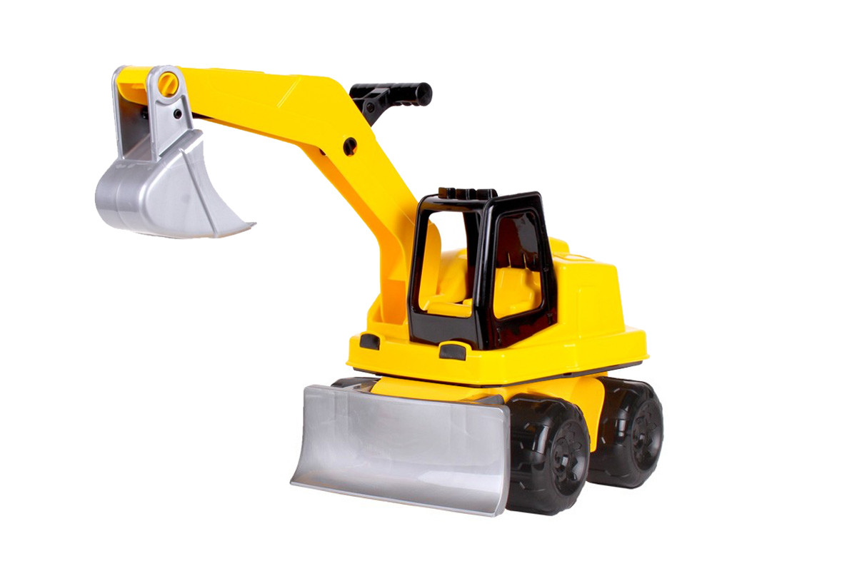 Кабіна іграшкового трактора обертається на 180 градусів, а ківш регулюється за допомогою спеціального важеля. Колеса трактора великі, міцні та надійні.