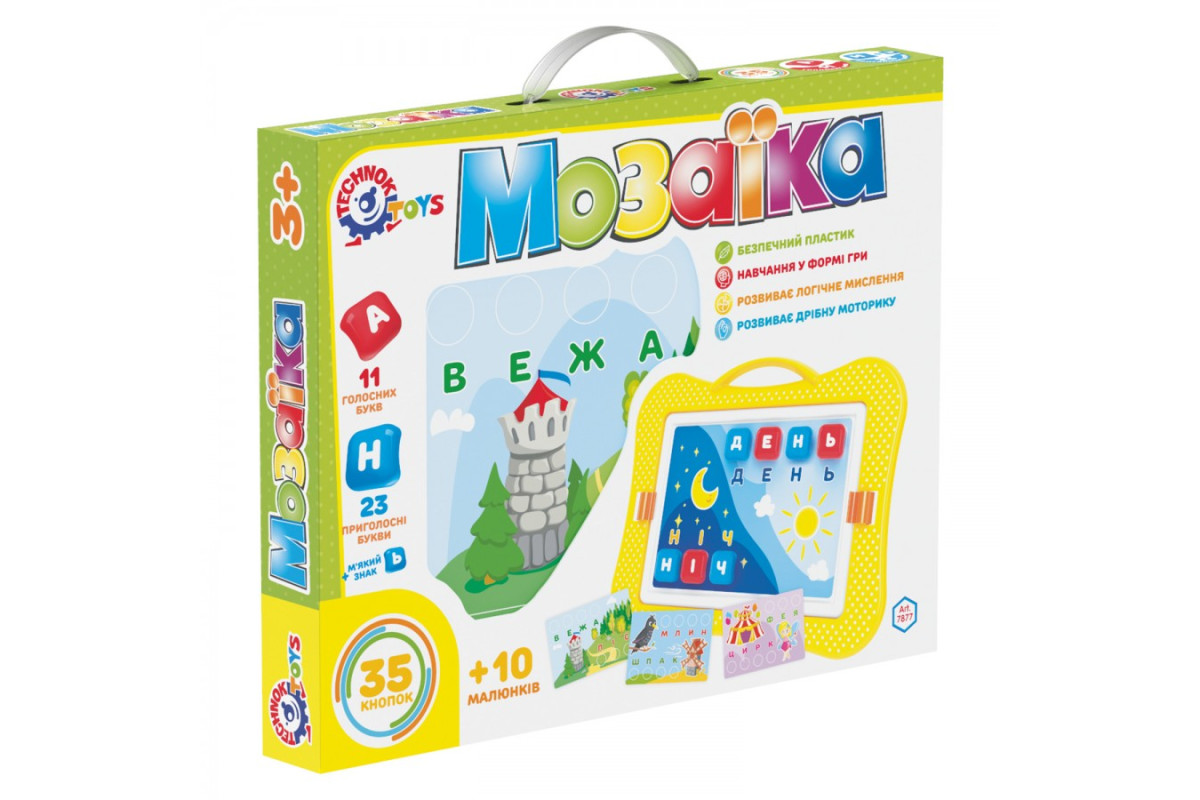 У "Мозаїці ТехноК" є все для цікавого дозвілля та ефективного навчання. На велику яскраву валізку з ручкою кріпиться пластикове поле з отворами. В комплекті - 35 кнопок з нанесеними буквами: 11 голосних та 23 приголосних. Колір кнопок підібраний спеціально до букви - голосні на червоних, а приголосні на блакитних.