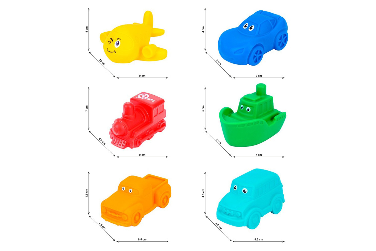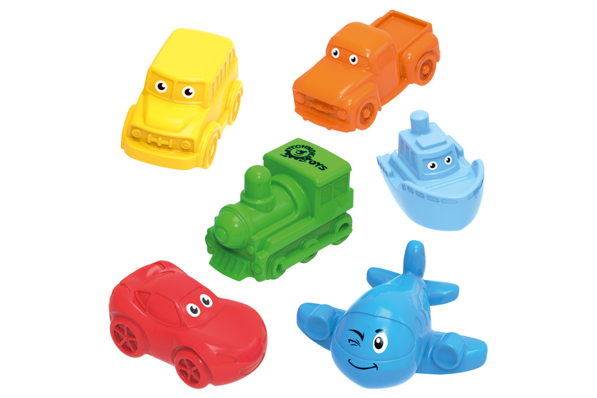 "Набір для ванної ТехноК" – це кольорові іграшки для купання із захопливого світу транспорту. Тут швидкісний спорткар, місткий автобус, маневровий літачок, потужний пікап, великий паротяг та веселий кораблик. Надруковані оченятаметодом тамподруку додають іграшкам радісних емоцій та краси, з ними машинки ніби оживають. Транспорт добре тримається на воді, що дає можливість дітлахам придумувати різноманітні ігри. З ними також цікаво гратися і "на суші" – влаштувати перегони, відкрити автосервіс, припаркувати машинки у гаражі, а літак в ангарі та багато-багато інших.